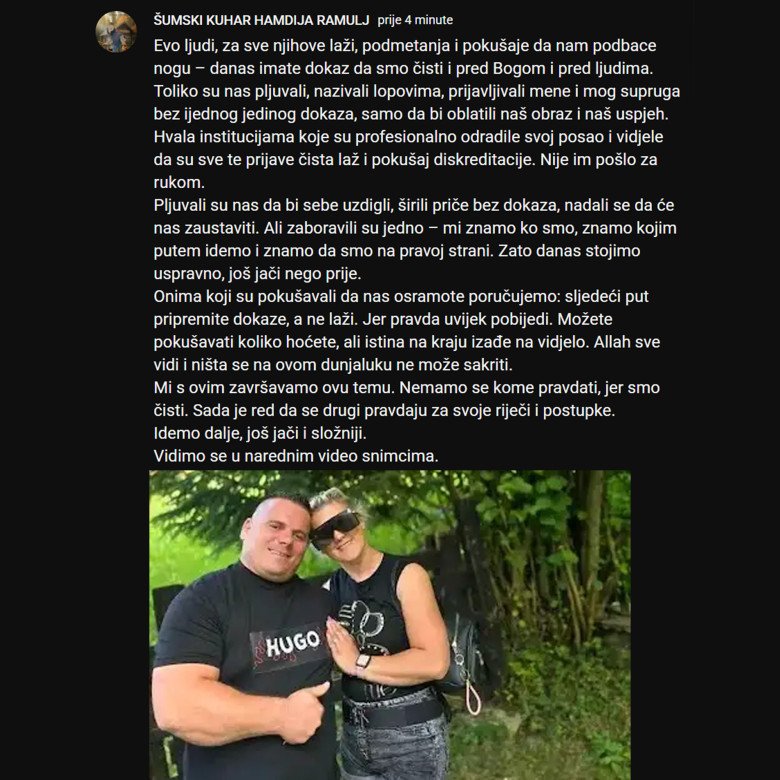 Institucije nisu utvrdile da se nad vama vrši pokušaj diskreditacije, nego su vam dostavile rozu kovertu da vas obavijeste o sudskoj odluci, odnosno procesu. Ne pljuju se drugi ljudi da bi se onaj ko pljuje uzdigao, jer se tako čovjek ne može uzdići. To nema ni smisla, jer ne postoji detalj života u kojem ste vi ispred nekog drugog; ja barem ne vidim takav detalj. Znamo i mi ko ste i nikako niste na pravoj strani, jer krađa humanitarnog novca i prijetnje smrću ljudima i djeci nisu ispravna strana. Mi vas nismo pokušavali osramotiti, to samo vi sebi možete uraditi, a dokaze ćemo svaki put pripremiti kao i do sada.